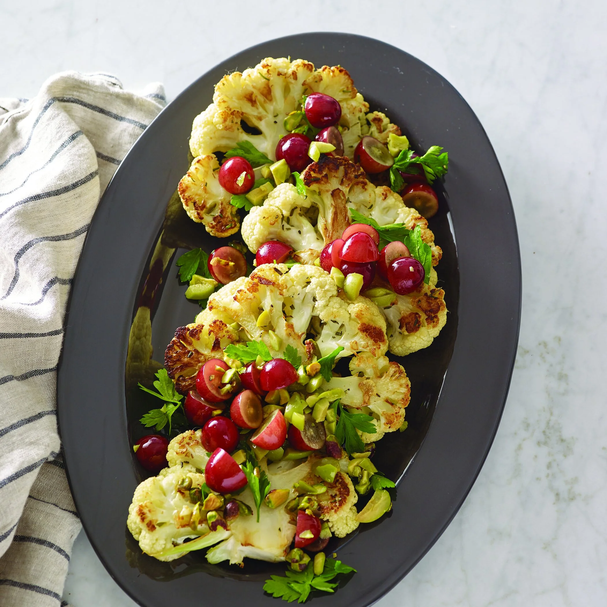 Combine remaining olive oil, remaining pepper, grapes, olives, parsley and pistachios. When cauliflower is roasted, transfer to serving plates and top with grape mixture.