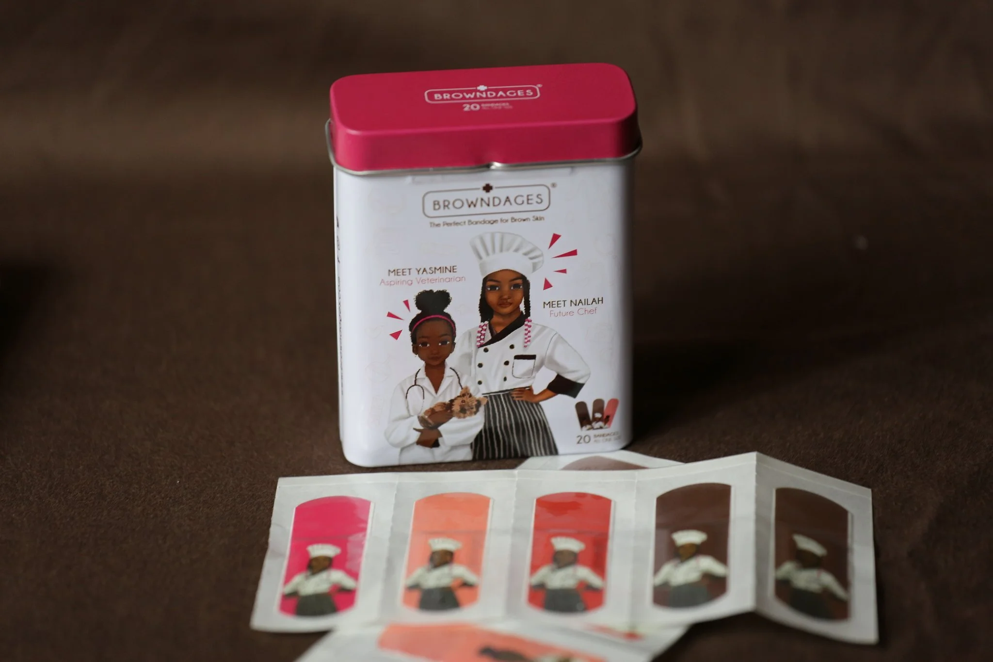 I was sent a pack of 20 girls bandages, tucked away neatly in a swaggy tin can that was cool to look at and informative to read. The bandages featured two characters, Gibson, an aspiring firewoman and Nova, a future florist. And while I opened the can expecting to find brown-toned bandages, these were actually all shades of purples, yellows, and red. Something for the kids I guess. Nice. Again, a practical pick. You can shop and learn more online at www.browndages.com.